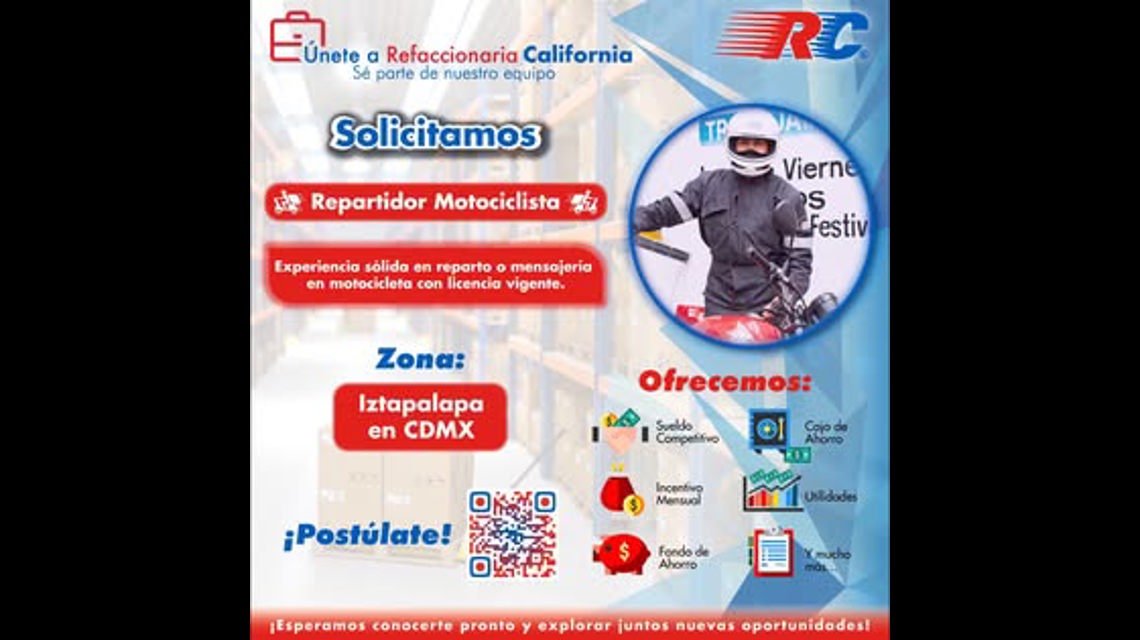 Si buscas una oportunidad para crecer en el sector almacén automotriz como repartidor en moto en Iztapalapa, ¡postúlate ya y forma parte de Refaccionaria California!